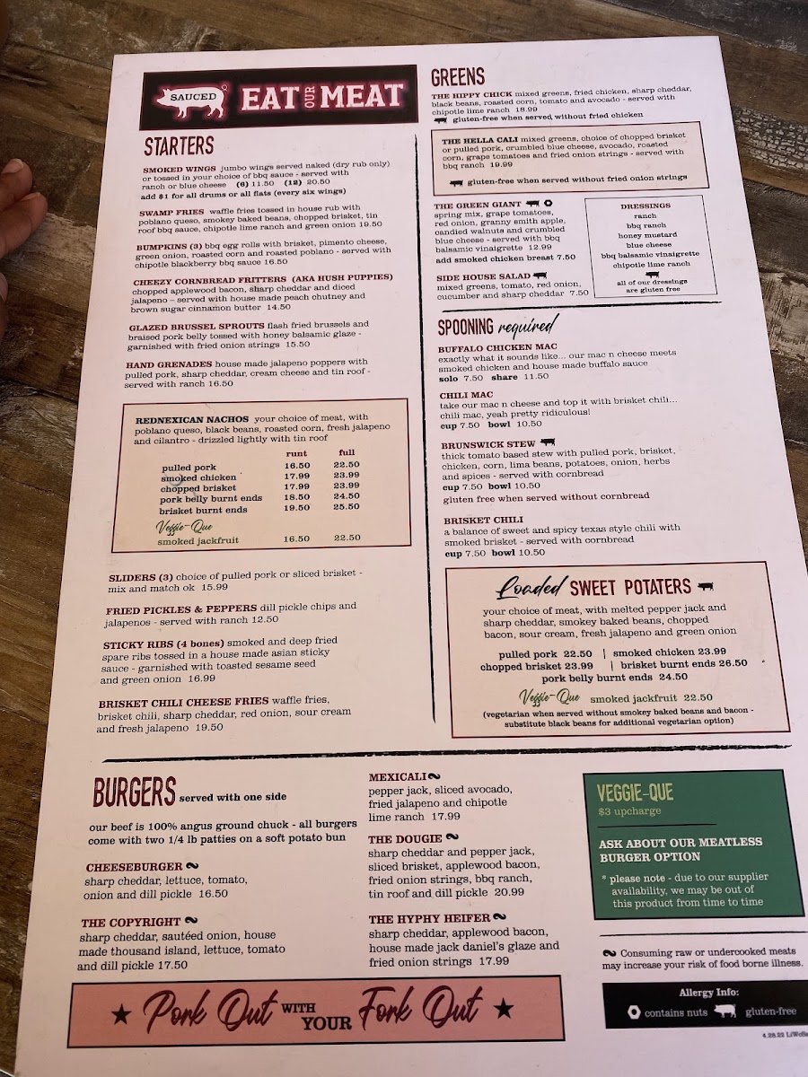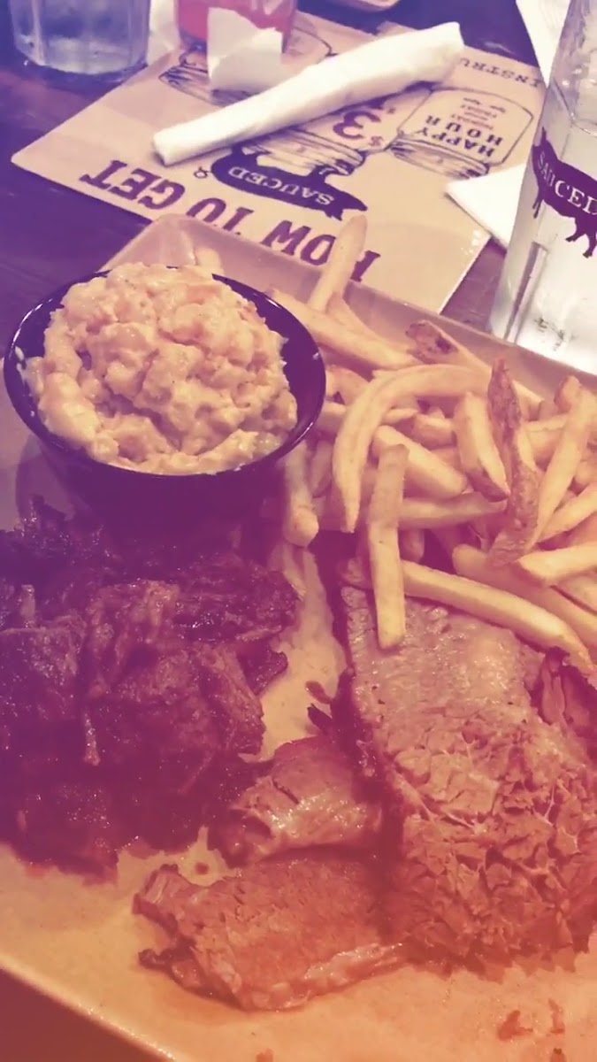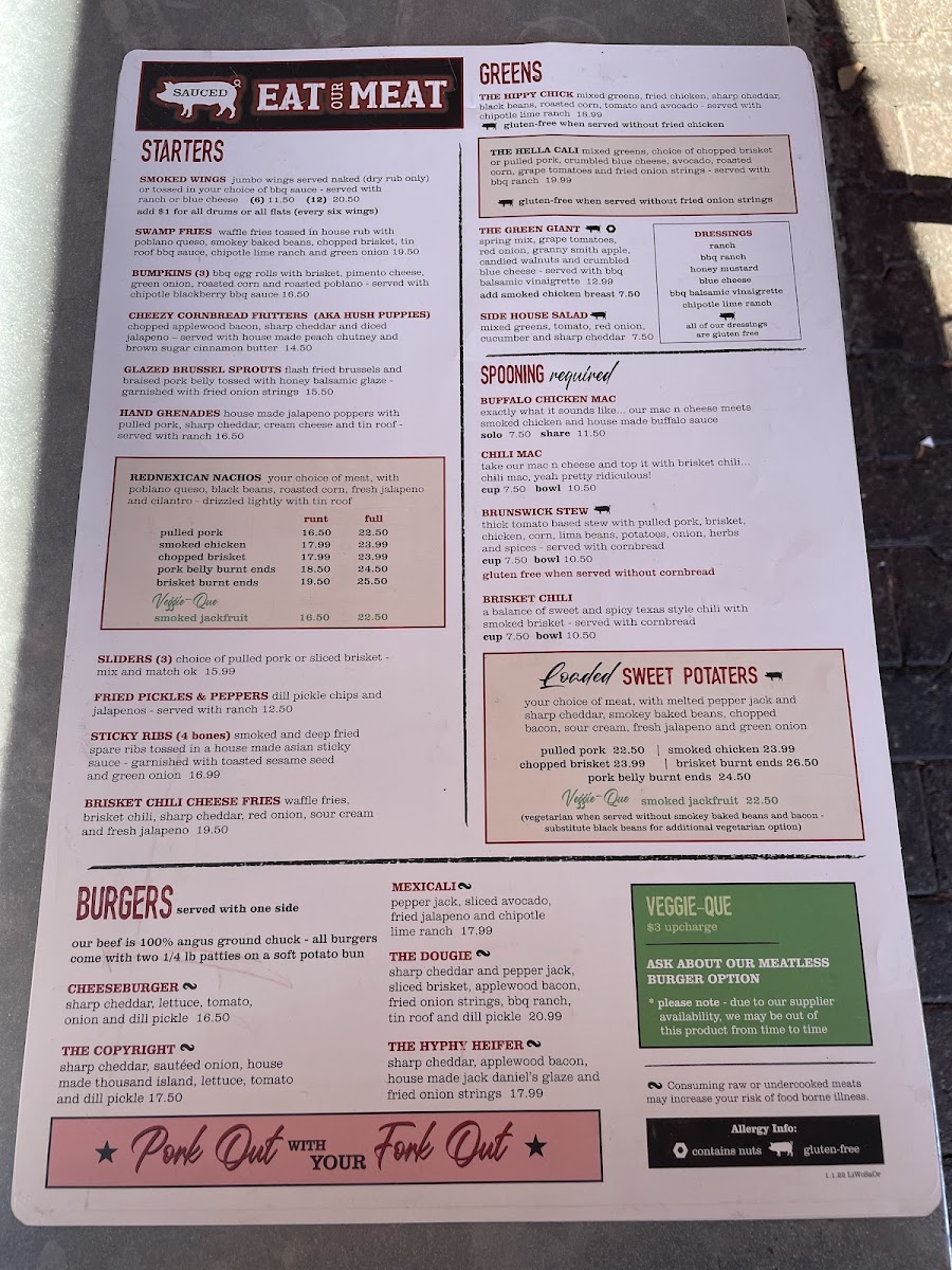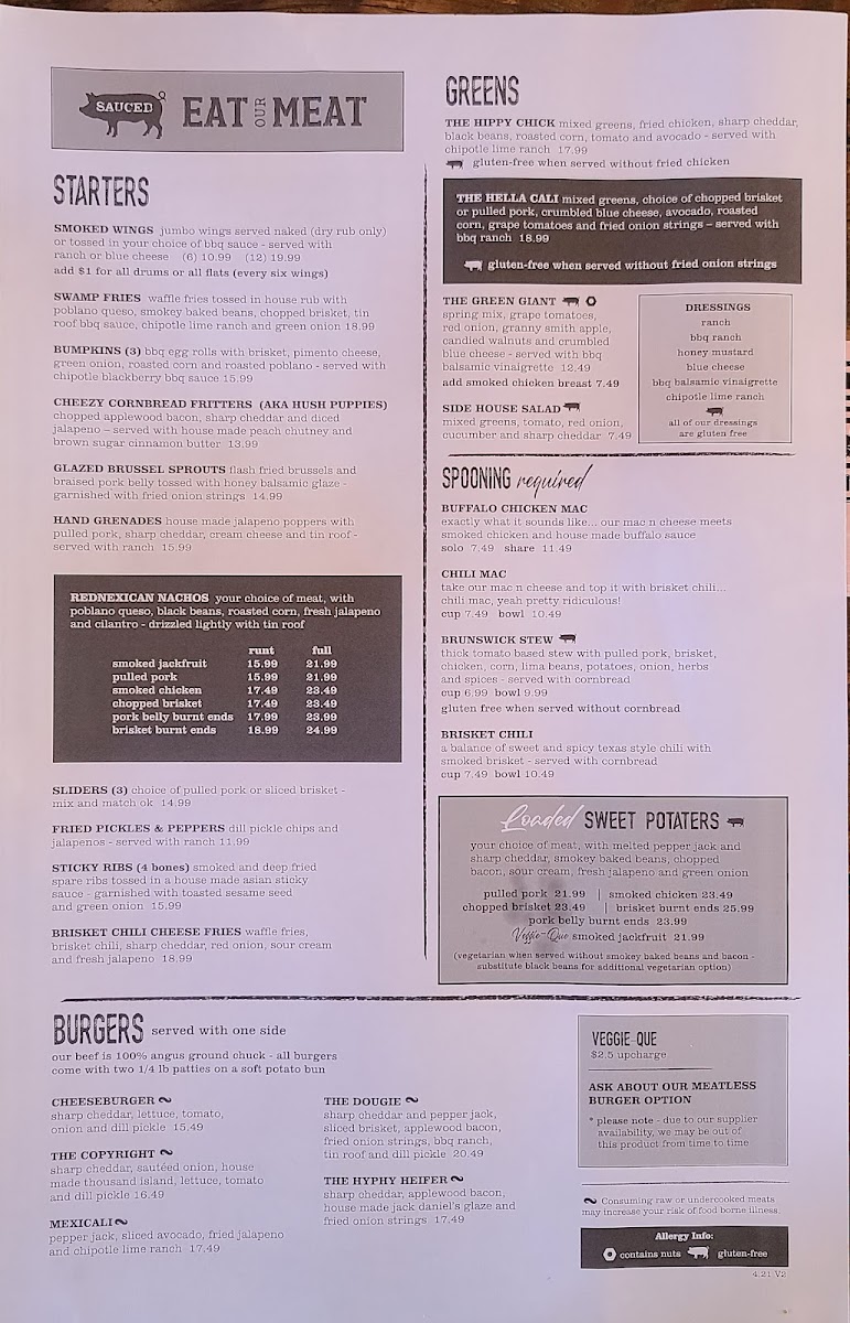 The menu at Sauced BBQ & Spirits showcases a diverse range of dishes that celebrate the essence of Southern barbecue. Start your meal with a plate of their Bavarian Pretzel, served with pub mustard or the Buffalo Cauliflower Bites, dressed in zesty buffalo sauce and topped with blue cheese crumbles for that perfect kick. If you're in the mood for something heartier, the Rednexican Nachos provide a delicious combination of your choice of meat, poblano queso, black beans, fire-roasted corn, fresh jalapeño, and a drizzle of “tin roof” sauce—indeed a feast for the senses!