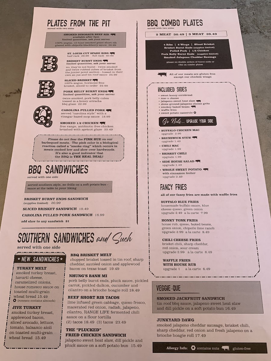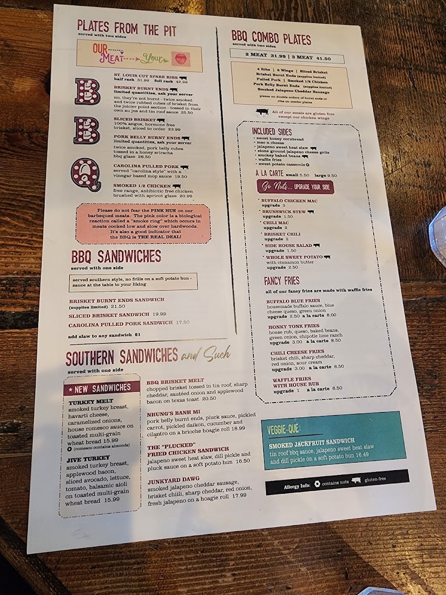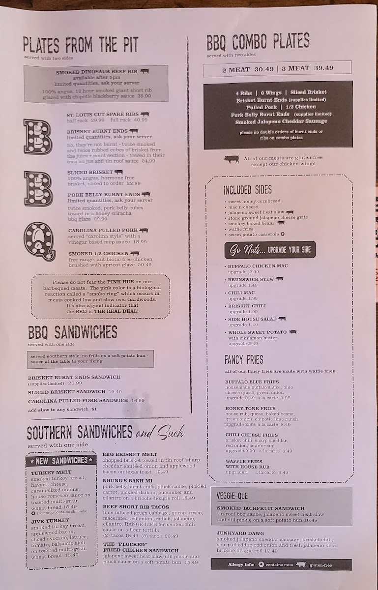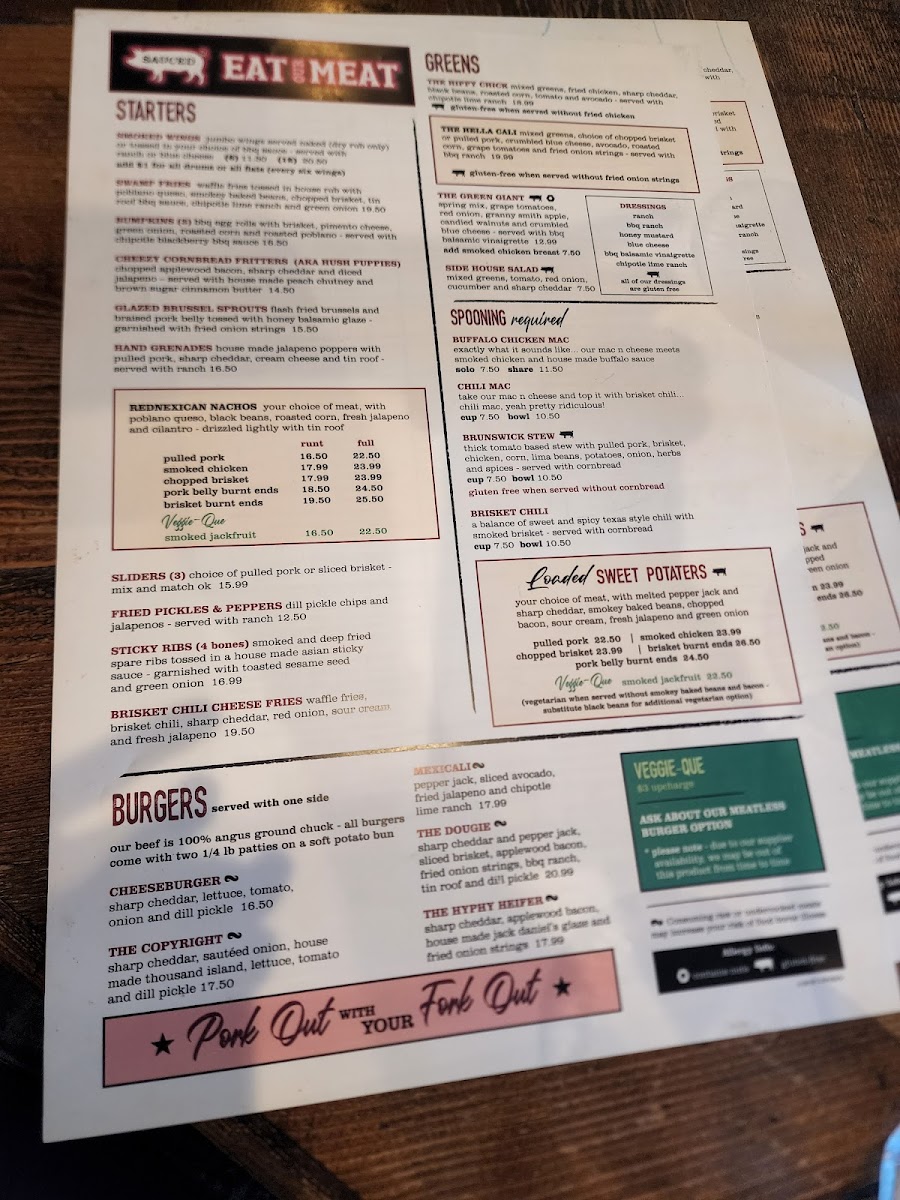 The menu at Sauced BBQ & Spirits showcases a diverse range of dishes that celebrate the essence of Southern barbecue. Start your meal with a plate of their Bavarian Pretzel, served with pub mustard or the Buffalo Cauliflower Bites, dressed in zesty buffalo sauce and topped with blue cheese crumbles for that perfect kick. If you're in the mood for something heartier, the Rednexican Nachos provide a delicious combination of your choice of meat, poblano queso, black beans, fire-roasted corn, fresh jalapeño, and a drizzle of “tin roof” sauce—indeed a feast for the senses!